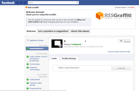 RssGraffiti è un’applicazione che svolge egregiamente il proprio compito di condivisione dei contenuti. Facebook offre anche altre soluzioni da provare. Per il nostro compito è sufficiente RssGraffiti. E seguire pochi semplici passi: